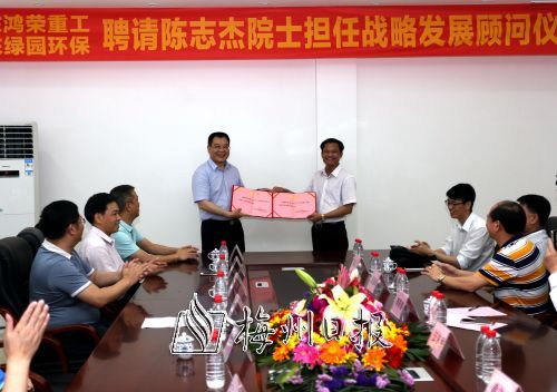 5月15日上午,廣東鴻榮重工股份有限公司和廣東綠園環(huán)保科技有限公司舉行聘請中國工程院陳志杰院士為兩家公司戰(zhàn)略發(fā)展顧問儀式,陳志杰院士在現(xiàn)場為企業(yè)未來的發(fā)展布局把脈開方。梅州日報(bào)社總經(jīng)理羅金良,梅縣區(qū)區(qū)委常委黃增國、春天集團(tuán)董事長李陽春、鴻榮重工總經(jīng)理吳柏強(qiáng)、綠園環(huán)??偨?jīng)理黃立新等參加了聘請儀式。
